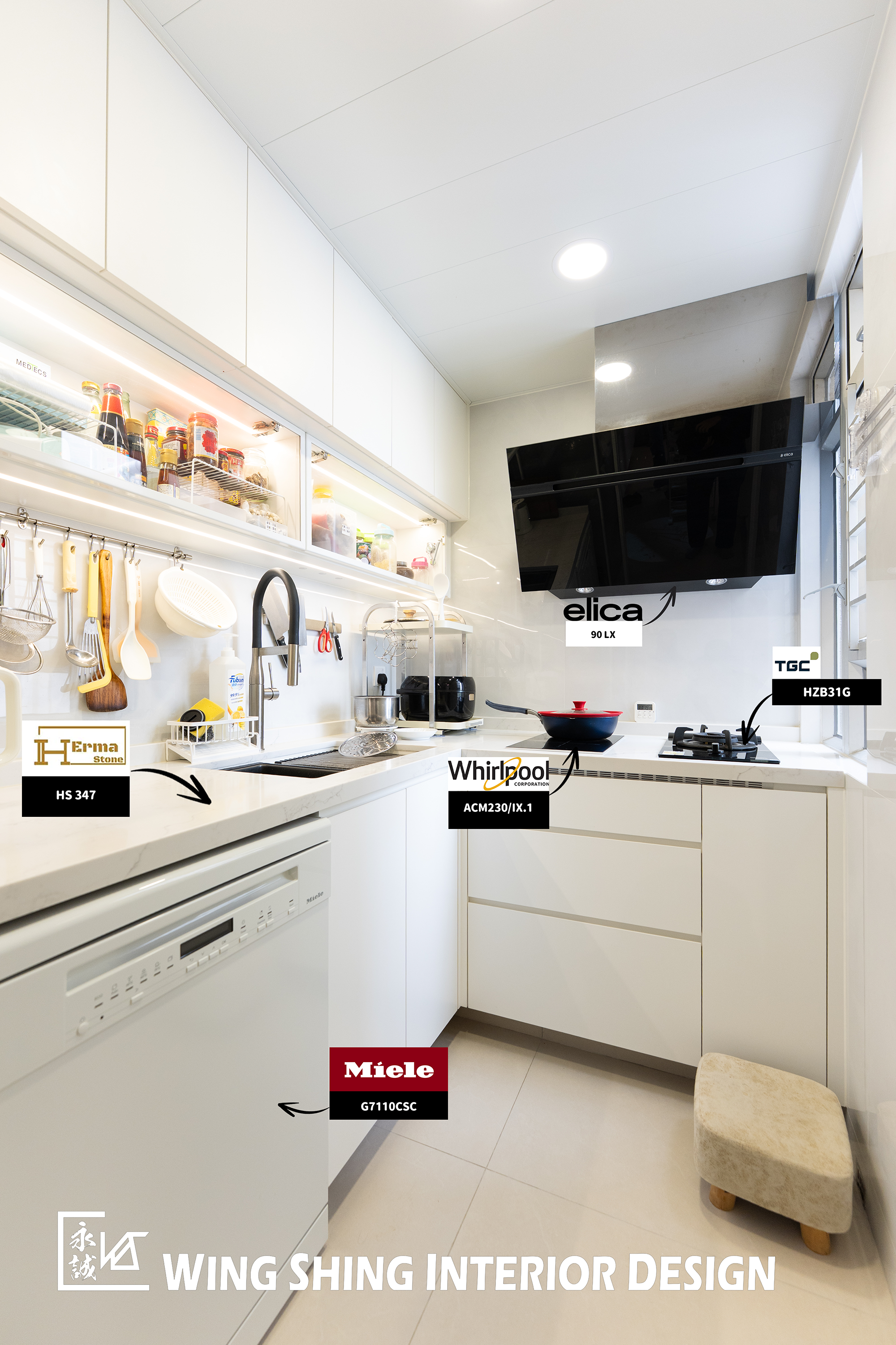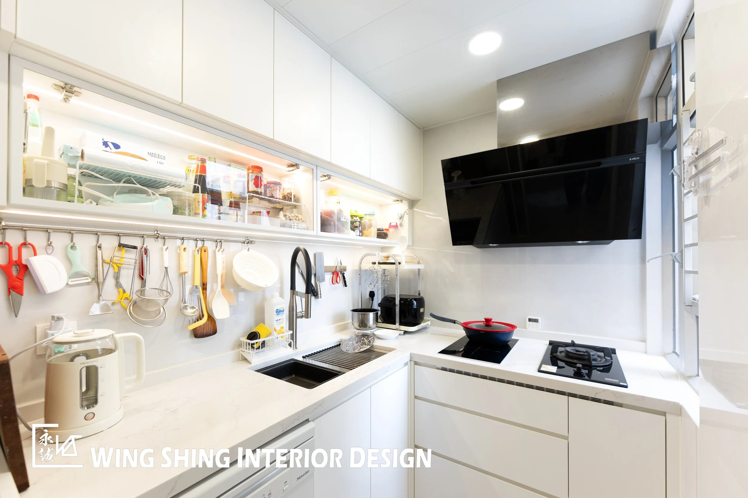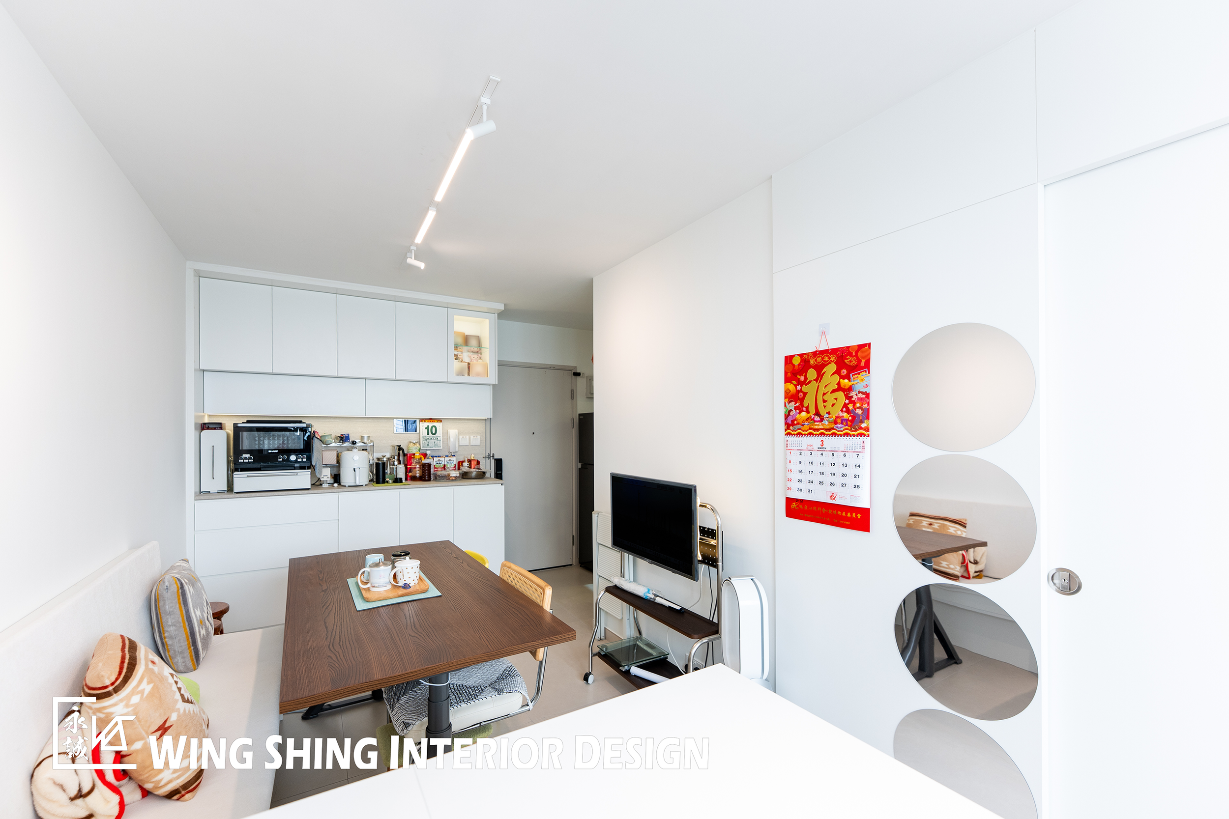 一旁的桌邊櫃作為主要雜物收納區,上櫃採用白色面板吊櫃搭配玻璃櫃組合。