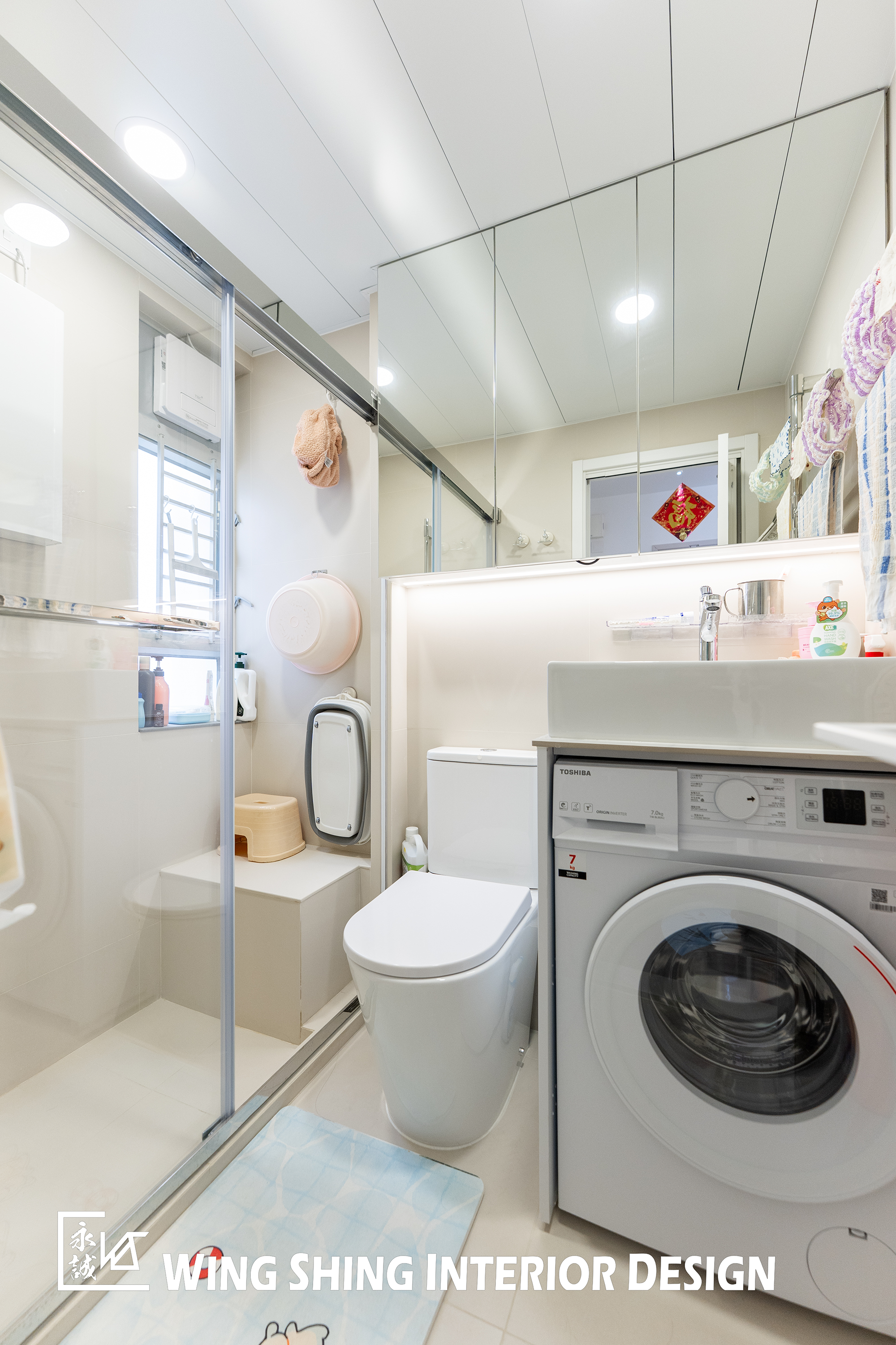 洗衣機嵌入櫃體與洗手台連成一體,上方延伸台面,讓洗衣、洗漱兩大機能在同一區域流暢銜接,解決放置洗衣機的難題。