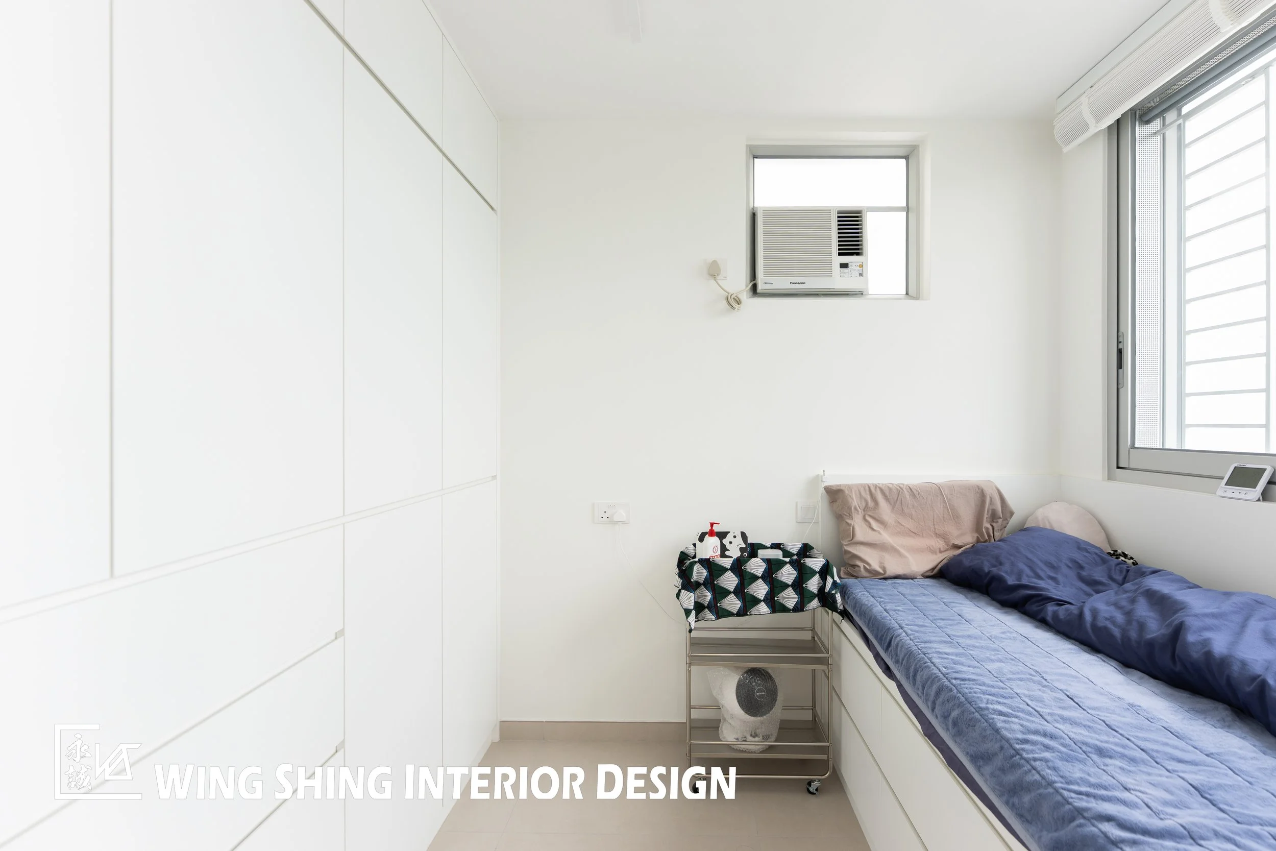 純白色貫穿到底,衣櫃無把手線條勾勒出利落的視覺語言,將收納機能隱藏於平整的面板之下,讓空間顯得通透而整齊。