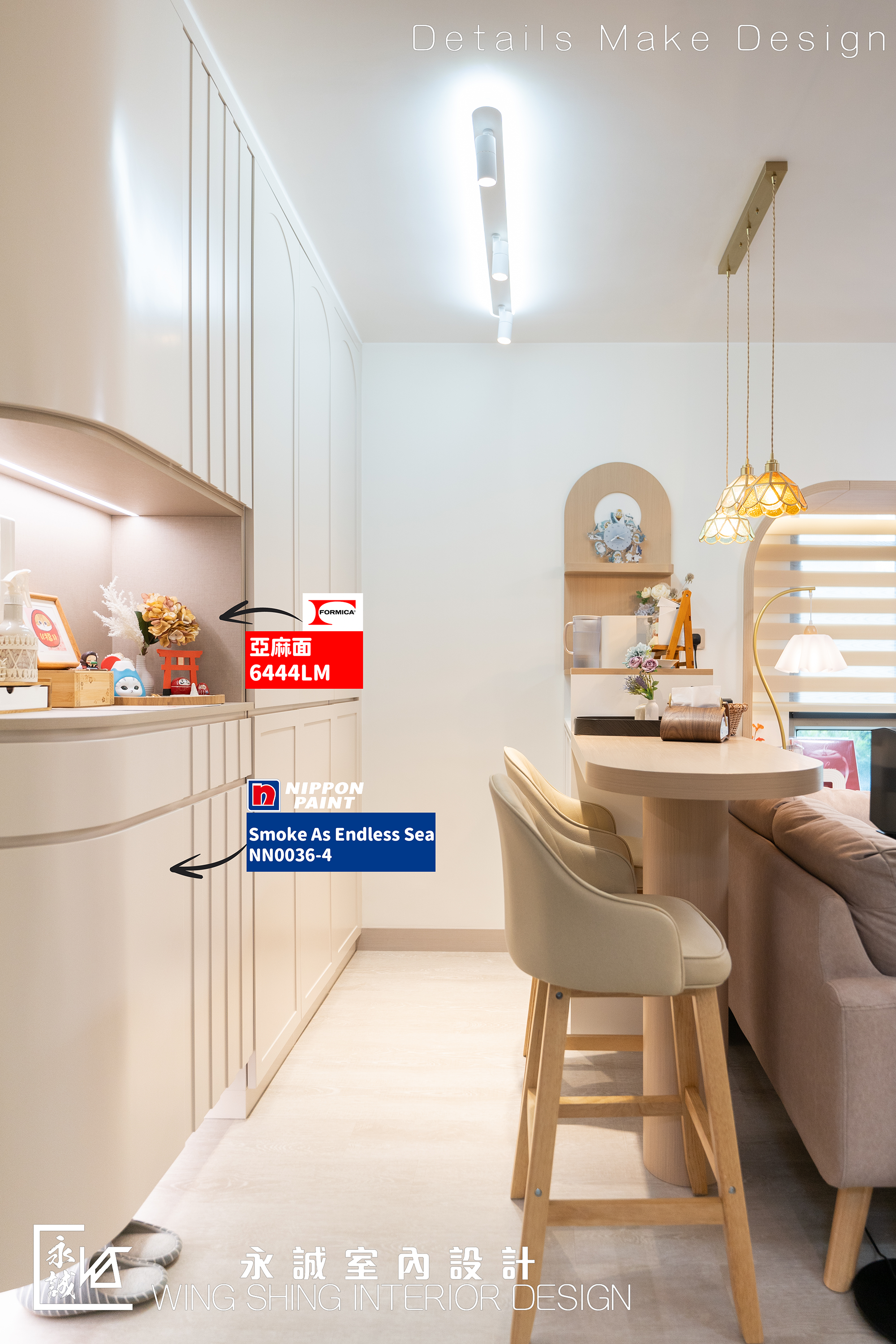 整體配色以大面積的奶油色系搭配法式復古明抽的地櫃,