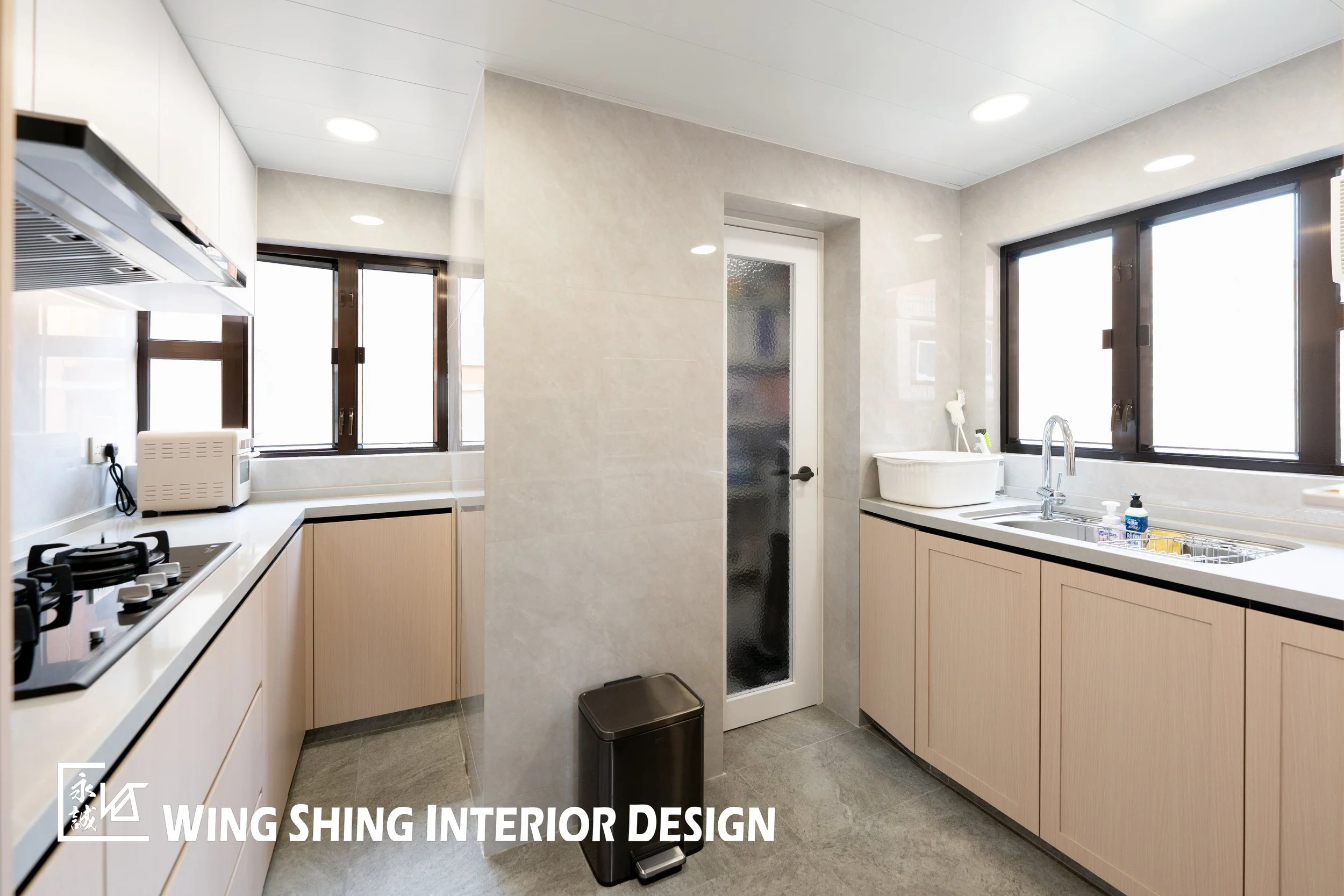 大 U 型佈局讓廚房操作動線更流暢順手,柔和的淺木色櫃體搭配沈穩的灰色瓷磚,鋪就明亮通透開闊的基調。