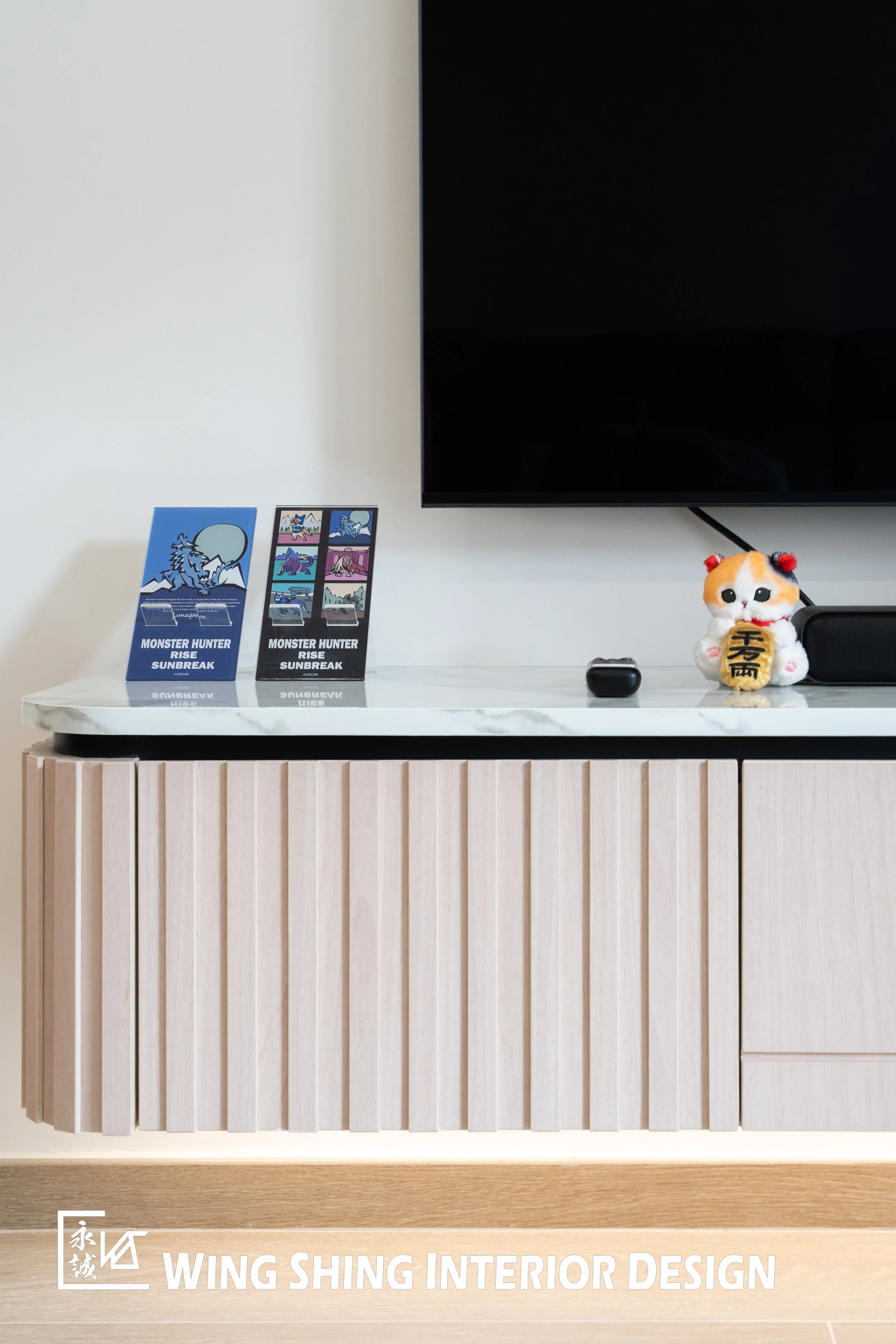淺木色為基底,搭配白色板塊與細黑線條做分割,消解大面積櫃體的單調感。