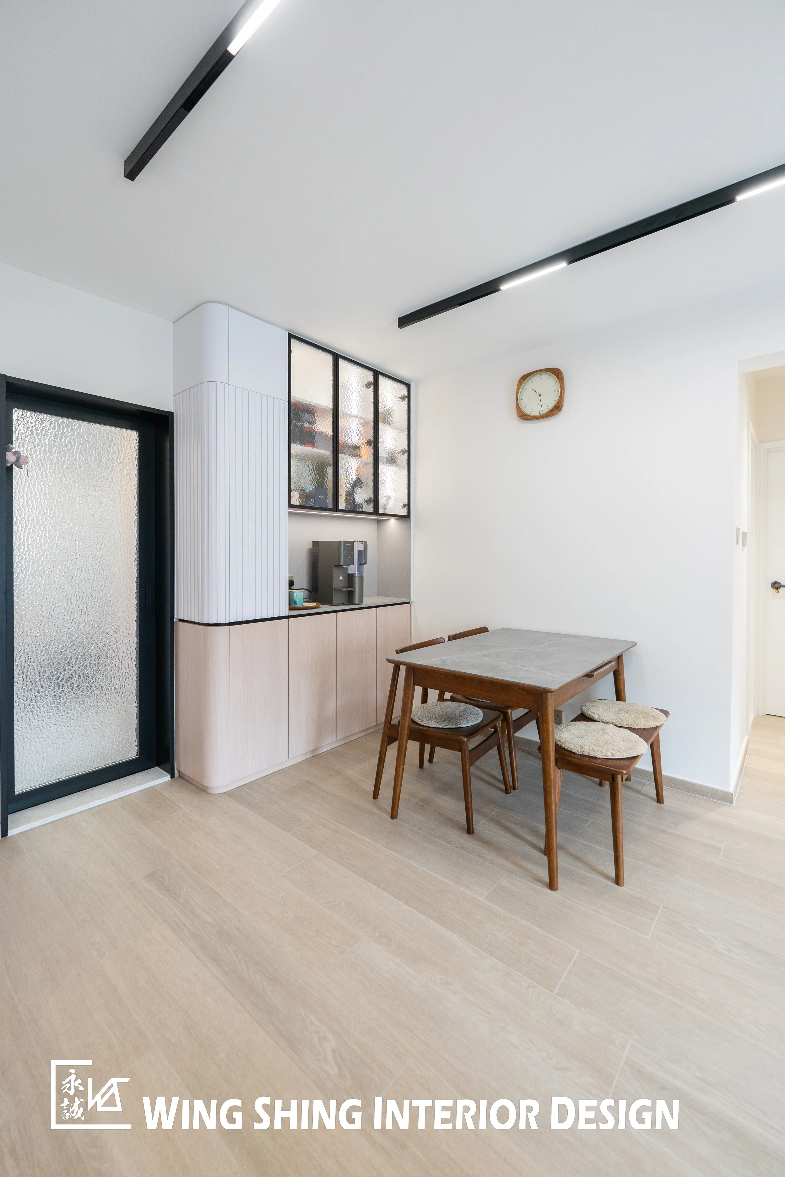 整個空間以白色作底色,像晨霧漫過的素箋,幹凈得不帶一絲冗雜,讓整個餐區的光線都變得柔和通透,淺木色櫃體表面,似觸手可及的暖,恰好中和了白的清冷;餐桌的灰是恰到好處的過渡色,柔和不沈悶。