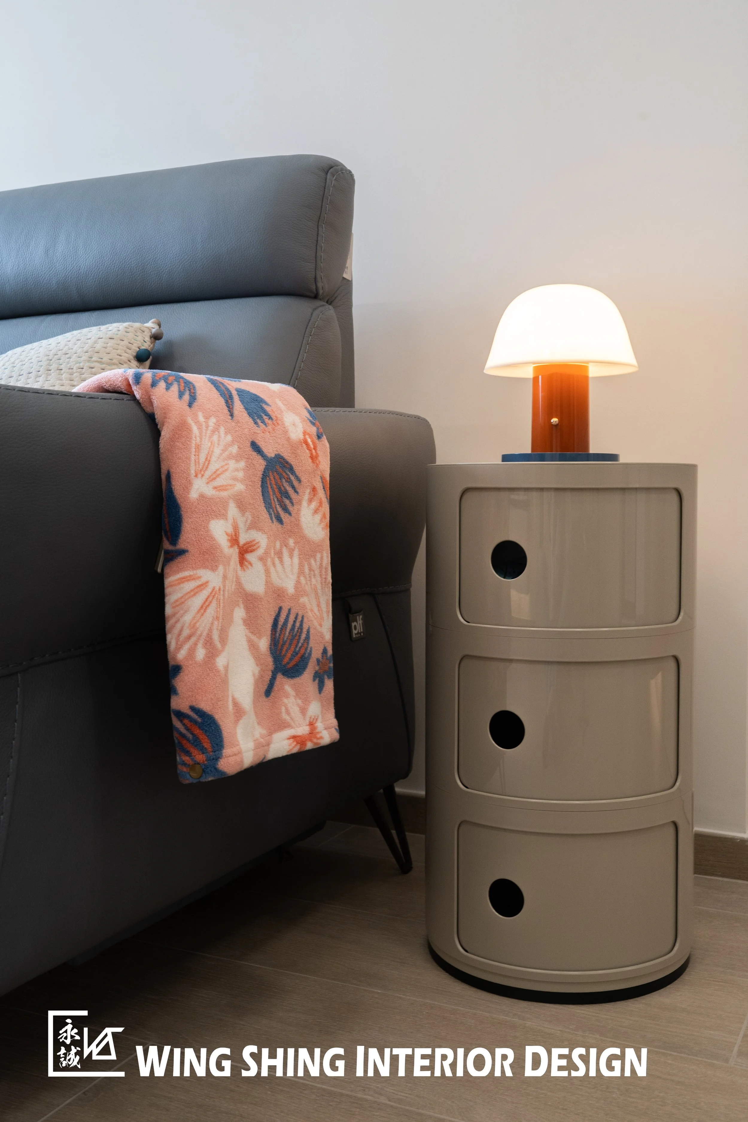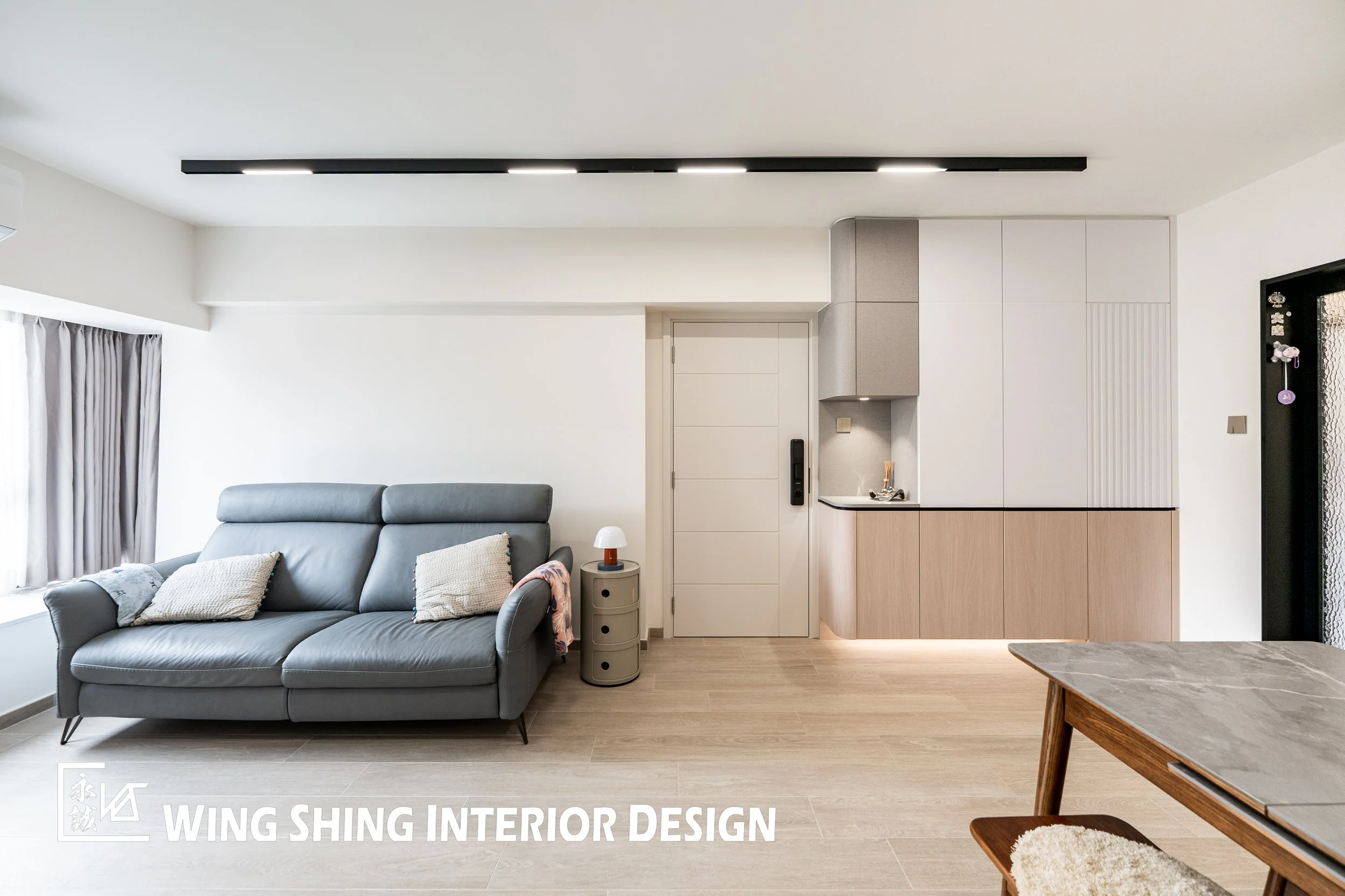 左側則採用上下通體櫃 + 地櫃儲物的組合,把垂直與地面空間都轉化為儲物區。