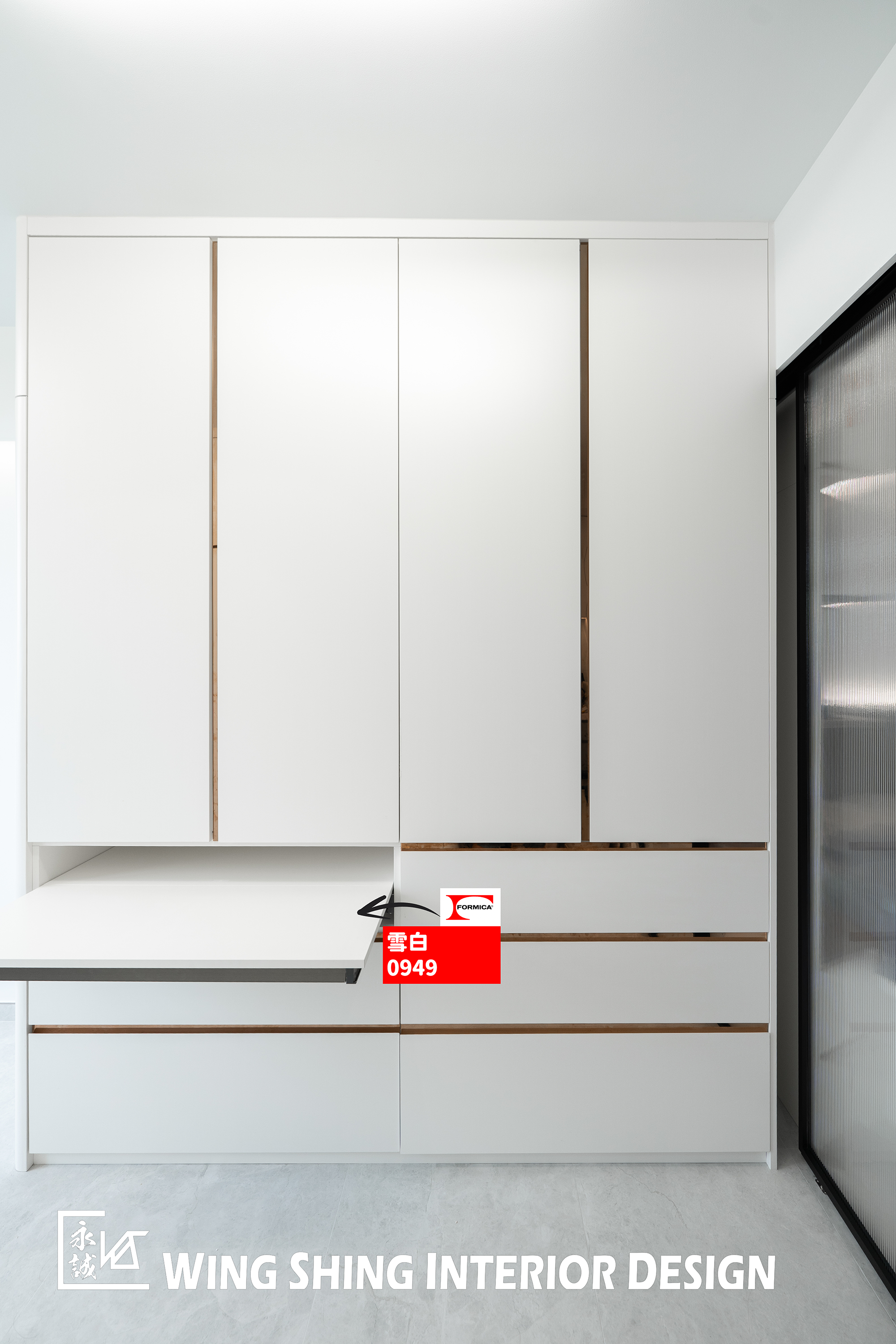 櫃體採用「無把手設計」,櫃門一體化造型讓視覺更簡淨,